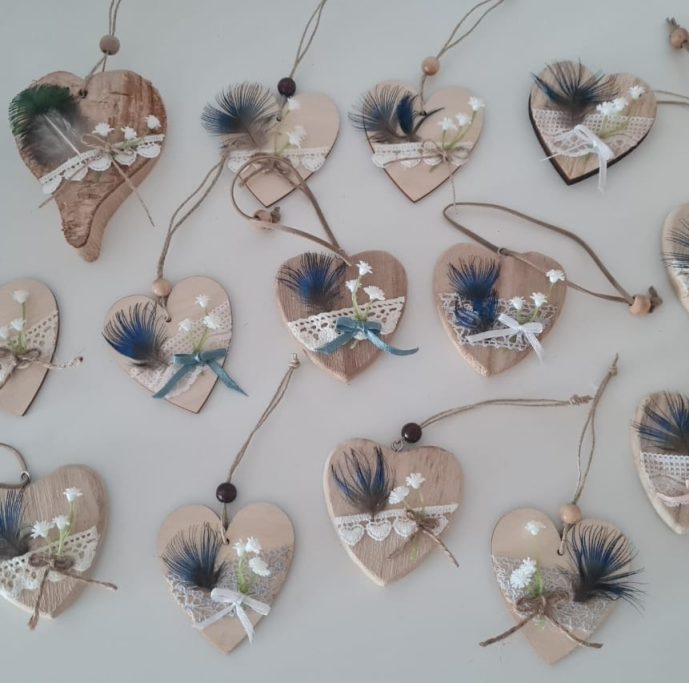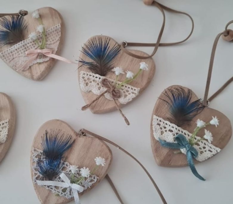 Aus schönen Federn kann man z. B. solche Anhänger gestalten. In meinem Fall waren es Pfauenfedern, die ich auf Holzherzen befestigt und mit Spitzenbändchen und Kunstblumen verziert habe.