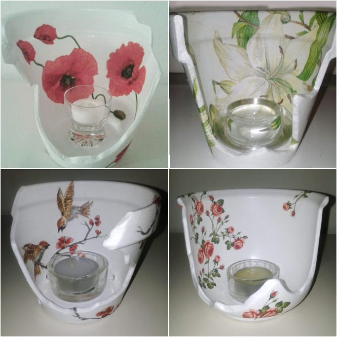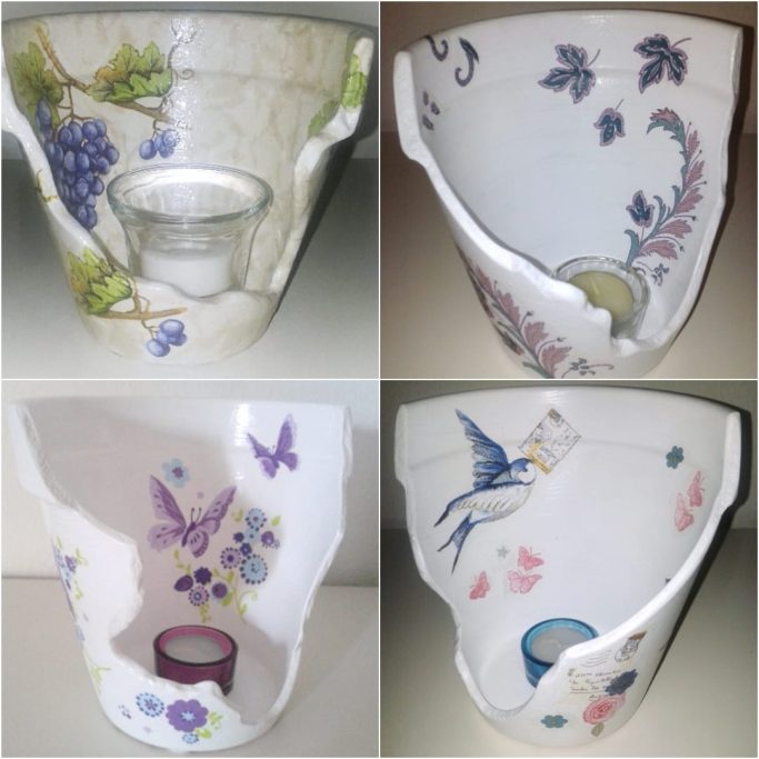 Aus Tontöpfe, die zerbrechen, kann man tolle Windlichter gestalten. Ich habe sie weiß grundiert und mit Servietten in floralem Muster gestaltet.