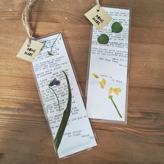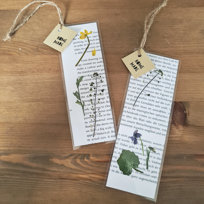 Auch ein altes Buch, dem schon Seiten fehlen, kann man noch verwenden. Ein paar Buchseiten in Lesezeichengröße ausschneiden und diese mit getrockneten Blumen laminiert.